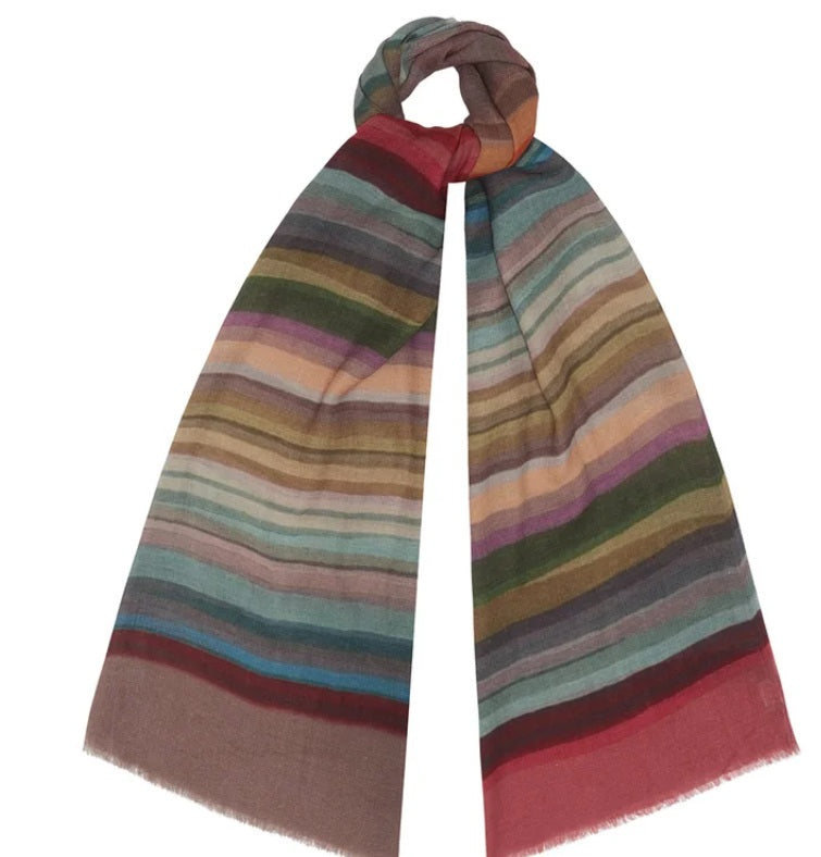 Multicoloured striped scarf in a colourful palette of heritage colours. The wool/silk blend is soft and luxurious.