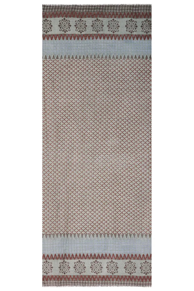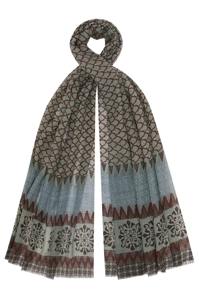 Duck Egg blues and browns dreamy screen printed wool scarf. The luxurious wool fibres feel super-soft on the skin.