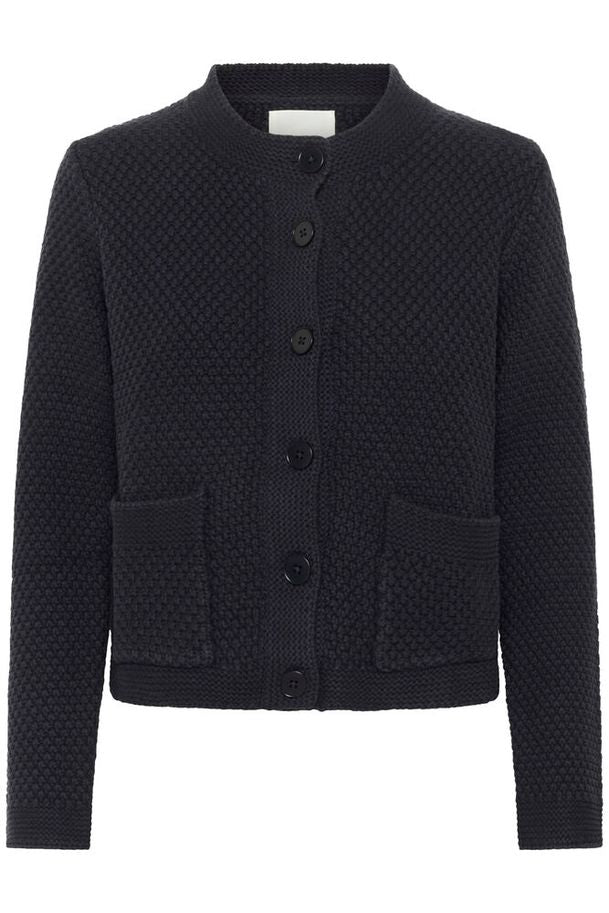 This dark navy knitted cardigan features a rich texture and a straight, cropped fit. The large patch pockets and front button fastening add a classic yet modern touch. Wear it over a shirt or dress for a layered look.
