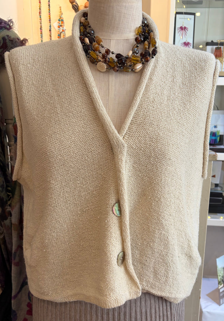 Knitted in 52% silk 48% lambswool this is a perfect layering piece for all seasons. Clever pockets to the sides, with 3 button front fastening.